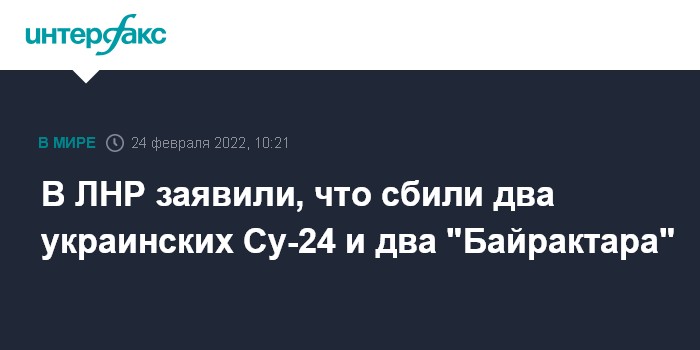 Москва. 24 февраля. INTERFAX.RU - Подразделения Народной милиции Луганской народной республики сбили два украинских военных самолета Су-24 в районе поселков Смелое и Степовое в Донбассе, сообщает пресс-служба НМ ЛНР.