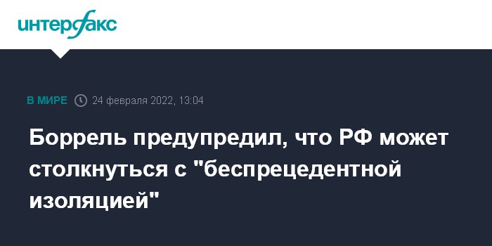Москва. 24 февраля. INTERFAX.RU - Москва может столкнуться с "беспрецедентной изоляцией" в связи с военной операцией в Донбассе, заявил глава дипломатии ЕС Жозеп Боррель в четверг.