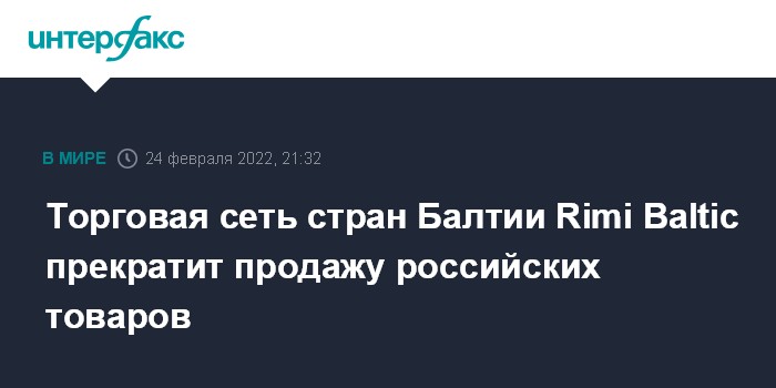 Москва. 24 февраля. INTERFAX.RU - Торговая сеть стран Балтии Rimi Baltic прекращает продажу российских товаров в знак солидарности с Украиной.