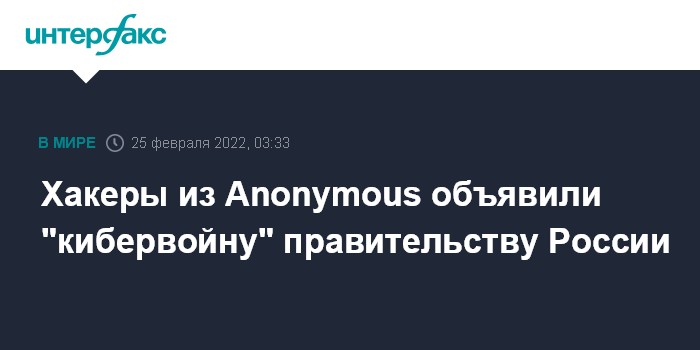Москва. 25 февраля. INTERFAX.RU - Хакеры из группы Anonymous заявили, что проводят кибератаки на Россию. Они взяли ответственность за DDoS-атаку на RT.