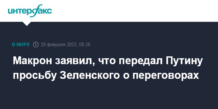 Москва. 25 февраля. INTERFAX.RU - Президент Франции Эммануэль Макрон заявил, что в телефонном разговоре в четверг с президентом России Владимиром Путиным передал ему просьбу президента Украины Владимира Зеленского о переговорах.