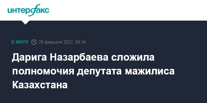 Москва. 25 февраля. INTERFAX.RU - Депутат мажилиса Казахстана, старшая дочь первого президента страны Нурсултана Назарбаева Дарига Назарбаева приняла решение сложить полномочия депутата мажилиса парламента республики.
