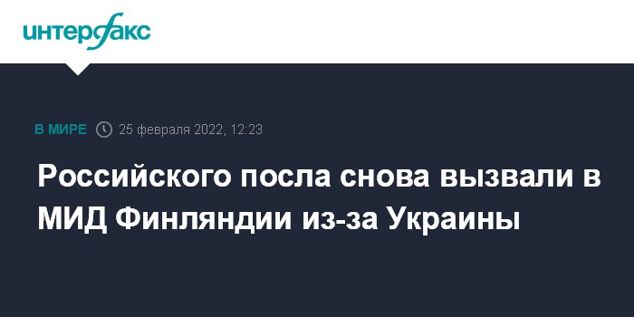 Москва. 25 февраля. INTERFAX.RU - Российского посла в Хельсинки Павла Кузнецова второй раз на этой неделе вызвали в МИД Финляндии в связи с российской спецоперацией на Украине, сообщило финское внешнеполитическое ведомство.