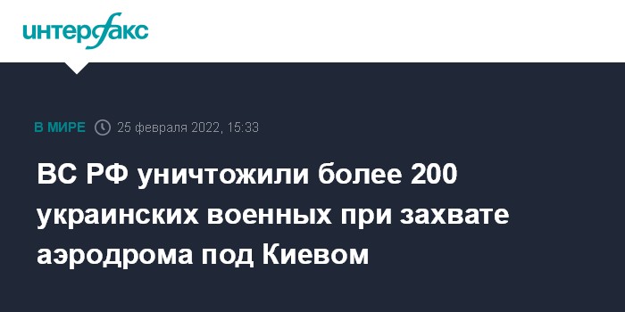 Москва. 25 февраля. INTERFAX.RU - Российские военные сообщили о взятии аэродрома в пригороде Киева и о потере украинской стороной в ходе этой операции более 200 человек.
