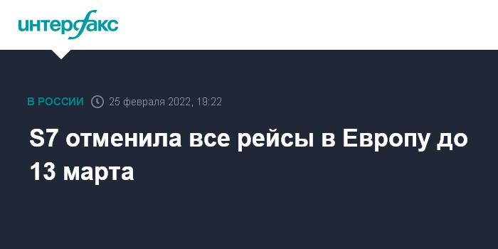 Москва. 25 февраля. INTERFAX.RU - Авиакомпания S7 Airlines решила отменить все рейсы в Европу с 26 февраля по 13 марта.