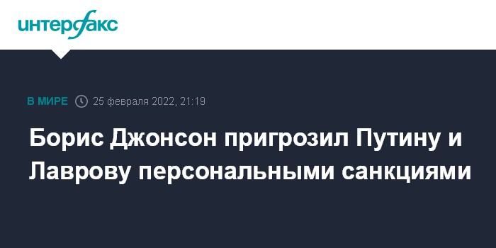 Москва. 25 февраля. INTERFAX.RU - Великобритания введет персональные санкции против президента и главы МИД России Владимира Путина и Сергея Лаврова, заявил премьер-министр страны Борис Джонсон. Такие же санкции уже ввел Евросоюз.