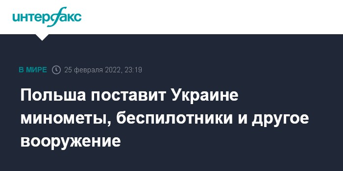 Москва. 25 февраля. INTERFAX.RU - Правительство Польши одобрило поставку Украине минометов и боеприпасов к ним, беспилотники и другое вооружение.