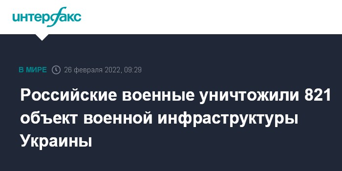 Москва. 26 февраля. INTERFAX.RU - Вооружённые силы РФ уничтожили на территории Украины 821 объект военной инфраструктуры, сообщил официальный представитель Минобороны России Игорь Конашенков на брифинге в субботу.