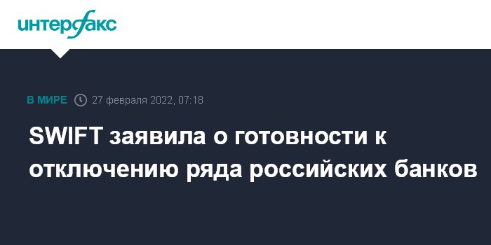 Москва. 27 февраля. INTERFAX.RU - Всемирная платежная система SWIFT будет готова исполнить решение США и ЕС об отключении от нее некоторых российских банков в случае получения соответствующего распоряжения, говорится в заявлении системы, сообщил телеканал NBC.