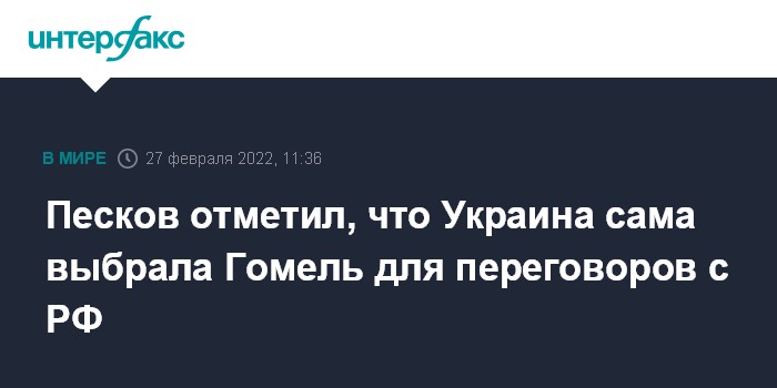Москва. 27 февраля. INTERFAX.RU - Украинская сторона сама предложила Гомель как место для переговоров с Россией, сообщил журналистам в воскресенье пресс-секретарь президента РФ Дмитрий Песков.