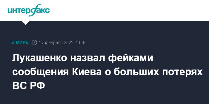 Москва. 27 февраля. INTERFAX.RU - Президент Белоруссии Александр Лукашенко назвал ложными заявления Киева о больших потерях российских военных в результате действий Вооруженных сил Украины.