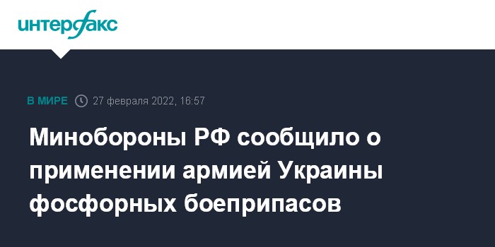 Москва. 27 февраля. INTERFAX.RU - Минобороны России заявило о применении украинской армией запрещенных ООН фосфорных боеприпасов в пригородах Киева вблизи аэродрома Гостомель.
