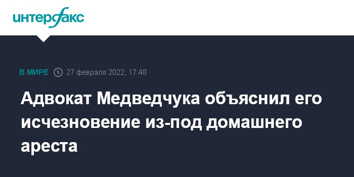 Москва. 27 февраля. INTERFAX.RU - Депутат Верховной рады Виктор Медведчук (фракция "Оппозиционная платформа - За жизнь") эвакуирован в безопасное место в Киеве из-за угрозы его жизни, заявила через пресс-службу партии его адвокат Лариса Чередниченко. Он остается под домашним арестом, добавила она.
