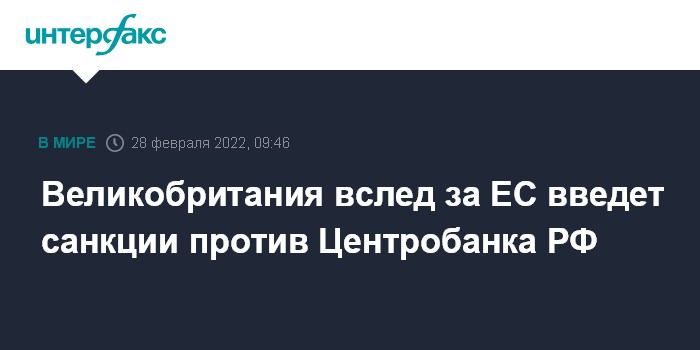 Москва. 28 февраля. INTERFAX.RU - Власти Великобритании объявили в понедельник о готовности расширить ограничительные меры против России и ввести санкции против Центрального банка.