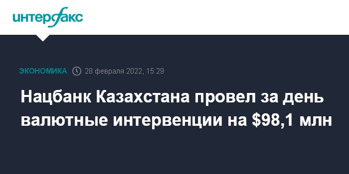 Нацбанк Казахстана 27 февраля сообщил, что готов проводить валютные интервенции при необходимости, объемы и частота будут зависеть от ситуации на внутреннем валютном рынке.