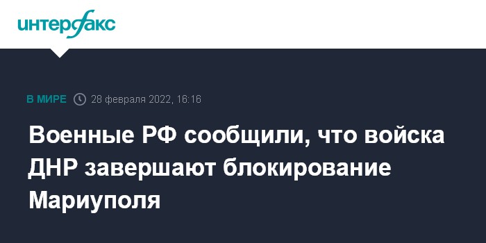 Москва. 28 февраля. INTERFAX.RU - Группировка войск ДНР завершает блокирование Мариуполя, сообщил официальный представитель Минобороны РФ Игорь Конашенков.