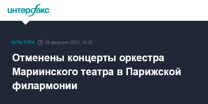 Москва. 28 февраля. INTERFAX.RU - Парижская филармония отменила запланированные на апрель концерты оркестра Мариинского театра под руководством дирижера Валерия Гергиева из-за событий, связанных с Украиной.