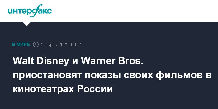 Москва. 1 марта. INTERFAX.RU - Американская компания The Walt Disney Company приостанавливает показ своих фильмов в России, компания Warner Bros. отложила премьеру фильма "Бэтмен" из-за ситуации на Украине, сообщают американские СМИ.