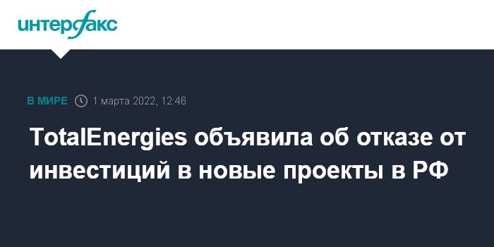 Москва. 1 марта. INTERFAX.RU - Французская TotalEnergies, один из крупнейших иностранных инвесторов в российском ТЭК, больше не будет обеспечивать финансирование для новых проектов в России, говорится в заявлении компании.