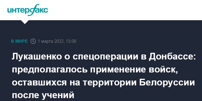 Москва. 1 марта. INTERFAX.RU - В операции на Украине предполагалось участие российских военных, которые остались в Белоруссии после совместных учений, заявил президент Белоруссии Александр Лукашенко.