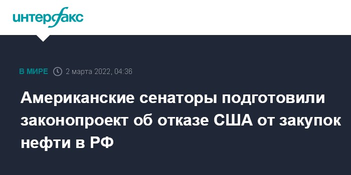 Москва. 2 марта. INTERFAX.RU - Группа американских сенаторов подготовила и представила Конгрессу законопроект о введении запрета на импорт Соединенными Штатами российской нефти, сообщила пресс-служба республиканца Роджера Маршалла, инициатора документа.