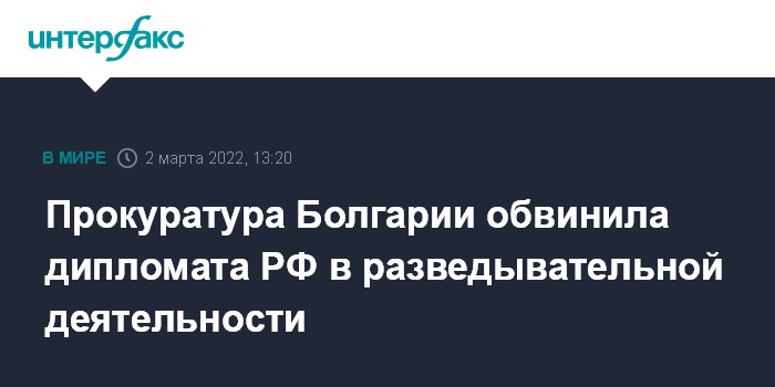 Москва. 2 марта. INTERFAX.RU - Прокуратура Болгарии выдвинула обвинения против дипломата РФ в сборе разведданных на территории страны.