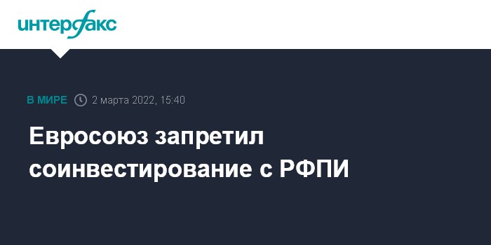 Москва. 2 марта. INTERFAX.RU - Евросоюз в рамках очередного пакета санкций в отношении России запретил соинвестирование с Российским фондом прямых инвестиций (РФПИ). Исключения могут быть сделаны по договорам, заключенным до даты введения ограничений. Соответствующее решение опубликовано в Официальном журнале ЕС.