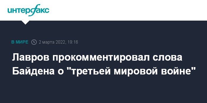 Москва. 2 марта. INTERFAX.RU - Глава МИД РФ Сергей Лавров переадресовал президенту США Джо Байдену вопрос о том, стоит ли мир на пороге третьей мировой войны.