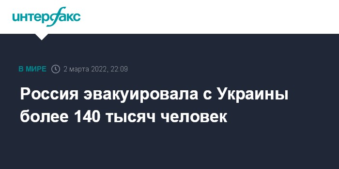 Москва. 2 марта. INTERFAX.RU - Россия эвакуировала с Украины более 140 тысяч человек, включая почти 40 тысяч детей, заявил начальник Национального центра управления обороной (НЦУО) РФ Михаил Мизинцев.