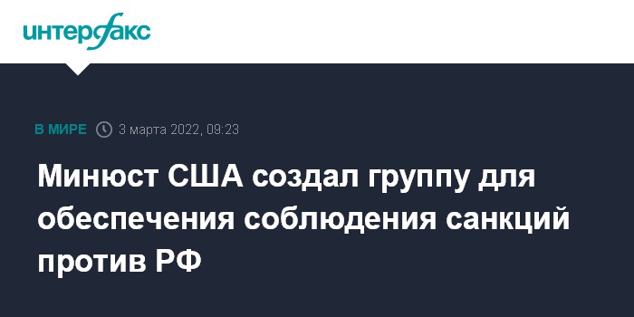 Москва. 3 марта. INTERFAX.RU - Минюст США создал межведомственную целевую группу, которая сосредоточится на обеспечении соблюдения санкций, экспортных ограничений и других мер против России, сообщает The Wall Street Journal.