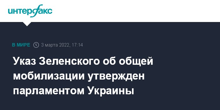 Москва. 3 марта. INTERFAX.RU - Верховная Рада утвердила указ президента Украины об общей мобилизации. Это решение принято на заседании в четверг. Об этом сообщает сайт Верховной Рады.