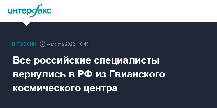 Москва. 4 марта. INTERFAX.RU - Самолет со всеми сотрудниками предприятий "Роскосмоса" прибыл в Москву из Гвианского космического центра, сообщили в пресс-службе госкорпорации.