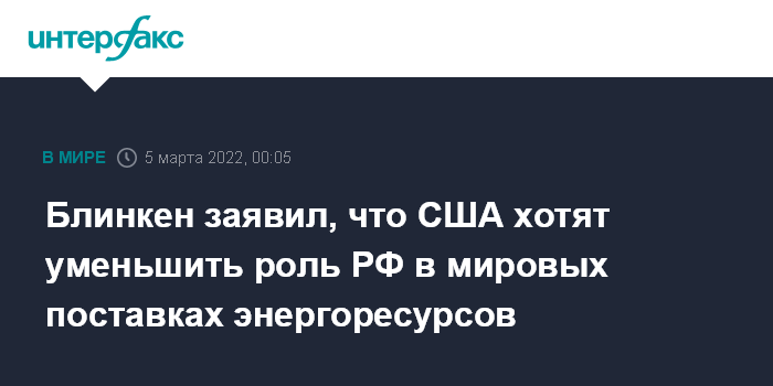 Москва. 4 марта. INTERFAX.RU - США не заинтересованы в глобальном сокращении предложения энергоресурсов, но стремятся понизить статус России как ведущего поставщика такой продукции, заявил в пятницу госсекретарь США Энтони Блинкен.