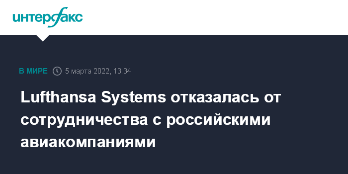 "Мы с беспокойством наблюдаем за нынешними драматическими событиями в российско-украинском конфликте и глубоко тронуты происходящим. Являясь ведущим поставщиком ИТ-услуг, Lufthansa Systems обслуживает около 350 клиентов международных авиакомпаний. Из них около десяти авиакомпаний - из России. Мы осознаем свою ответственность и действуем в соответствии с введенными санкциями. Поэтому Lufthansa Systems решила прекратить все услуги для российских клиентов", - говорится в письме Lufthansa Systems, подлинность которого подтвердил представитель крупной авиакомпании.