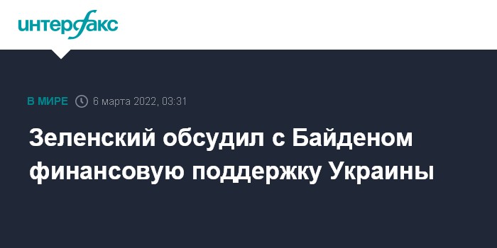 Москва. 6 марта. INTERFAX.RU - Президент Украины Владимир Зеленский обсудил по телефону с лидером США Джо Байденом дальнейшую поддержку Киева со стороны Вашингтона и антироссийские санкции за военную операцию РФ.