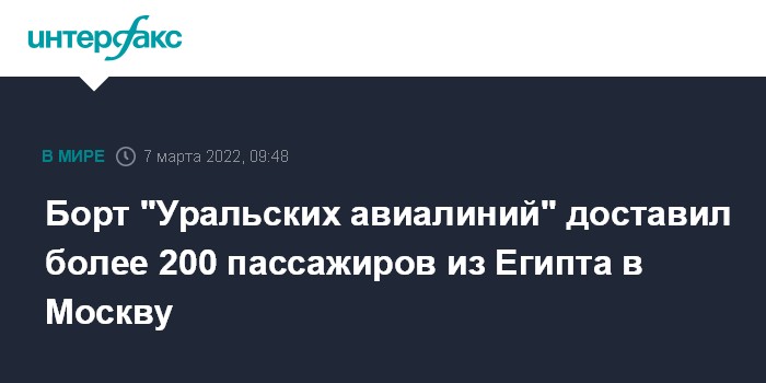 Москва. 7 марта. INTERFAX.RU - Самолет "Уральских авиалиний" с более чем 200 пассажирами прибыл в Москву из Шарм-эль-Шейха (Египет), сообщает пресс-служба авиакомпании.