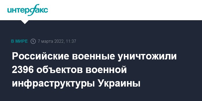 "Всего за время операции уничтожено 2 396 объектов военной инфраструктуры Украины", - заявил официальный представитель Минобороны РФ Игорь Конашенков на брифинге в понедельник.