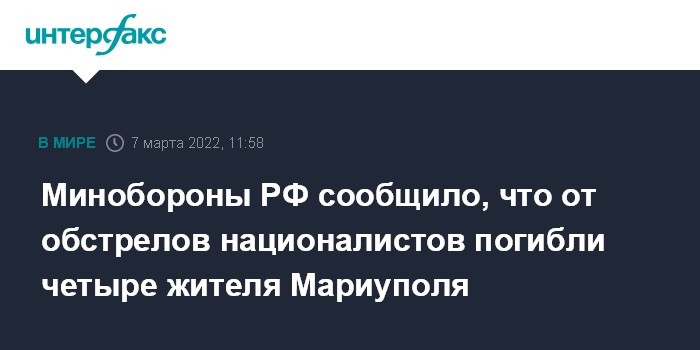 Москва. 7 марта. INTERFAX.RU - Российские военные заявили, что четыре мирных жителя погибли в Мариуполе из-за действий украинских националистических формирований.