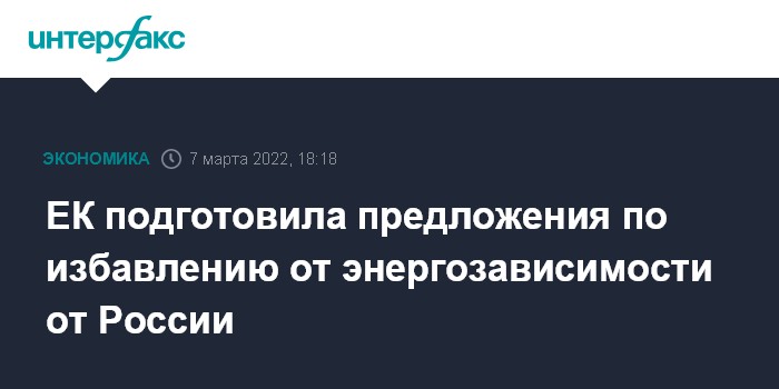 Москва. 7 марта. INTERFAX.RU - Председатель Еврокомиссии (ЕК) Урсула фон дер Ляйен объявила, что ЕК выдвинет во вторник предложения о том, каким образом покончить с зависимостью ЕС от российских энергетических источников.