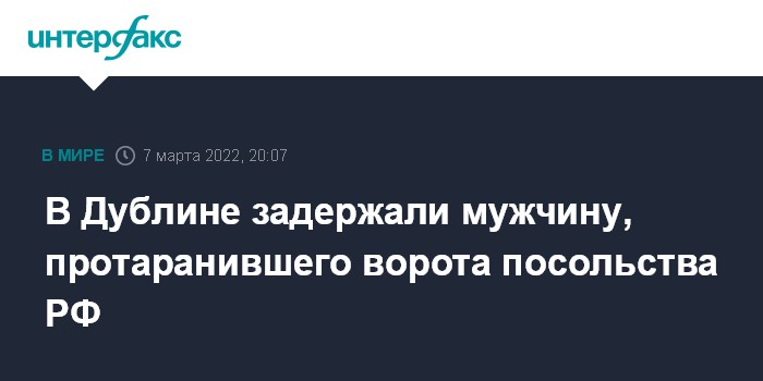 Москва. 7 марта. INTERFAX.RU - Полиция Ирландии задержала мужчину, протаранившего на грузовике ворота российского посольства в Дублине, передает в понедельник Sky News.