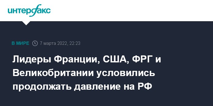 Москва. 7 марта. INTERFAX.RU - Лидеры Франции, США, Германии и Великобритании в ходе видеоконференции договорились, что будут продолжать оказывать давление на Россию в связи с ее военной операцией на Украине, сообщили в понедельник в Белом доме.