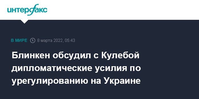 Блинкен подтвердил Кулебе солидарность Соединенных Штатов с народом Украины, также они "обсудили продолжающееся дипломатическое взаимодействие" двух стран.