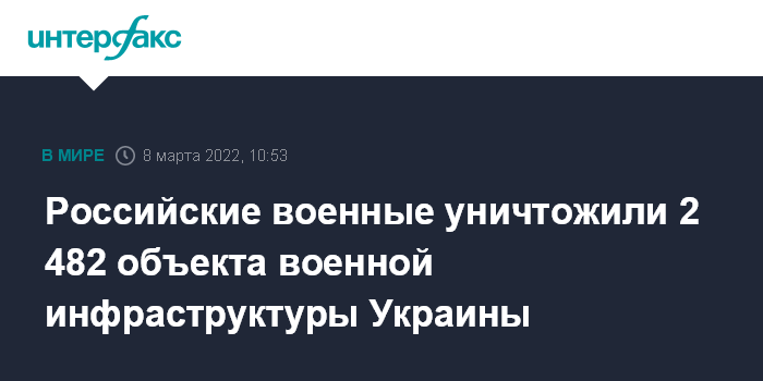 "Всего за время операции уничтожено 2482 объекта военной инфраструктуры Украины", - сообщил Конашенков.
