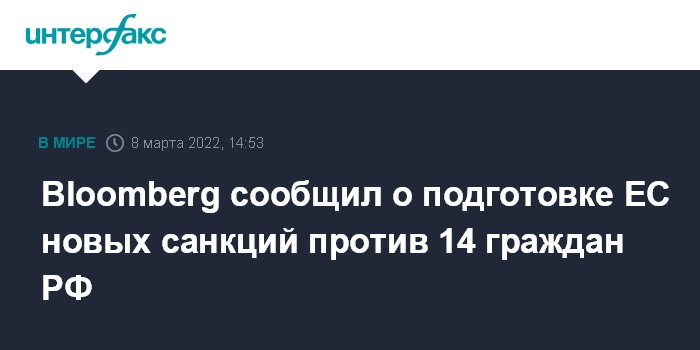 Москва. 8 марта. INTERFAX.RU - ЕС намерен подвергнуть санкциям 14 граждан России, в их числе ряд состоятельных людей, членов их семей, сообщает во вторник Bloomberg.