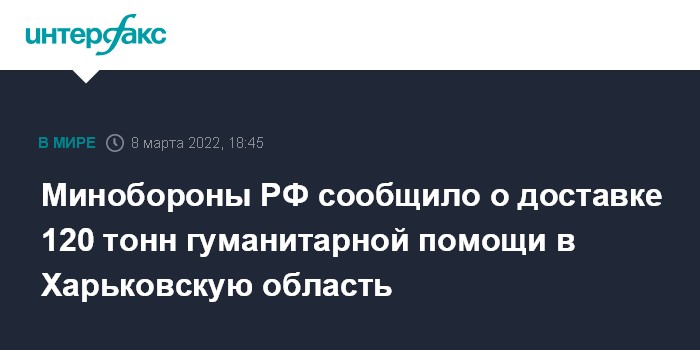 Минобороны РФ сообщило о доставке 120 тонн гуманитарной помощи в Харьковскую область