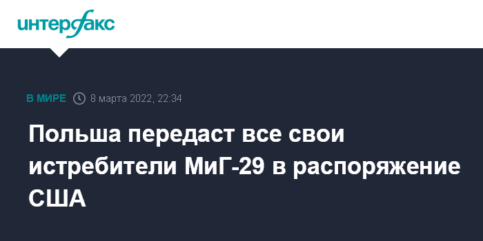 Ранее государственный секретарь США Энтони Блинкен сообщил, что США ищут способы быстро пополнить запасы польских истребителей, чтобы Польша могла предоставить Украине свои боевые самолеты.