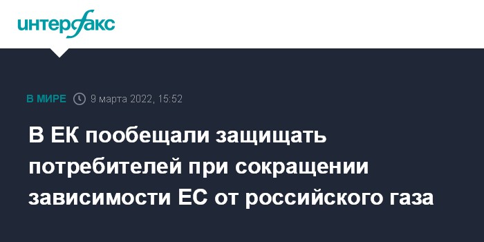Москва. 9 марта. INTERFAX.RU - Представленный 8 марта генеральный план по обеспечению независимости ЕС от российского газа предусматривает меры по защите потребителей от роста цен на энергоносители, заявил официальный представитель Еврокомиссии (ЕК) Тим Макфи.