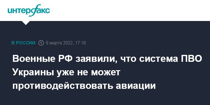 Москва. 9 марта. INTERFAX.RU - Система ПВО Украины носит только очаговый характер и не способна оказывать существенного противодействия российской авиации, сообщили в Минобороны РФ.