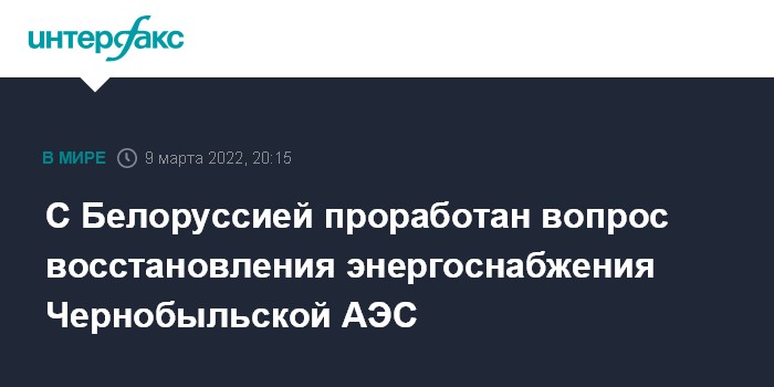 Москва. 9 марта. INTERFAX.RU - С Белоруссией проработан вопрос восстановления энергоснабжения Чернобыльской АЭС на Украине, сообщил заместитель министра энергетики РФ Павел Сорокин.