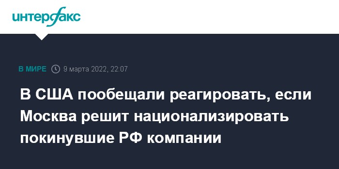 Единороссы призвали национализировать предприятия ушедших из РФ западных компанийЧитать подробнее"Мы приветствовали решения этих компаний (об уходе с рынка РФ - ИФ), но мы их к этому не подталкивали. Если они (власти России - ИФ) примут подобное решение (о национализации - ИФ), мы конечно предпримем меры, но пока ничего подобного не произошло", - сказала Псаки, отвечая на вопрос журналиста, попросившего комментарий по поводу звучащих в РФ предложений о национализации.